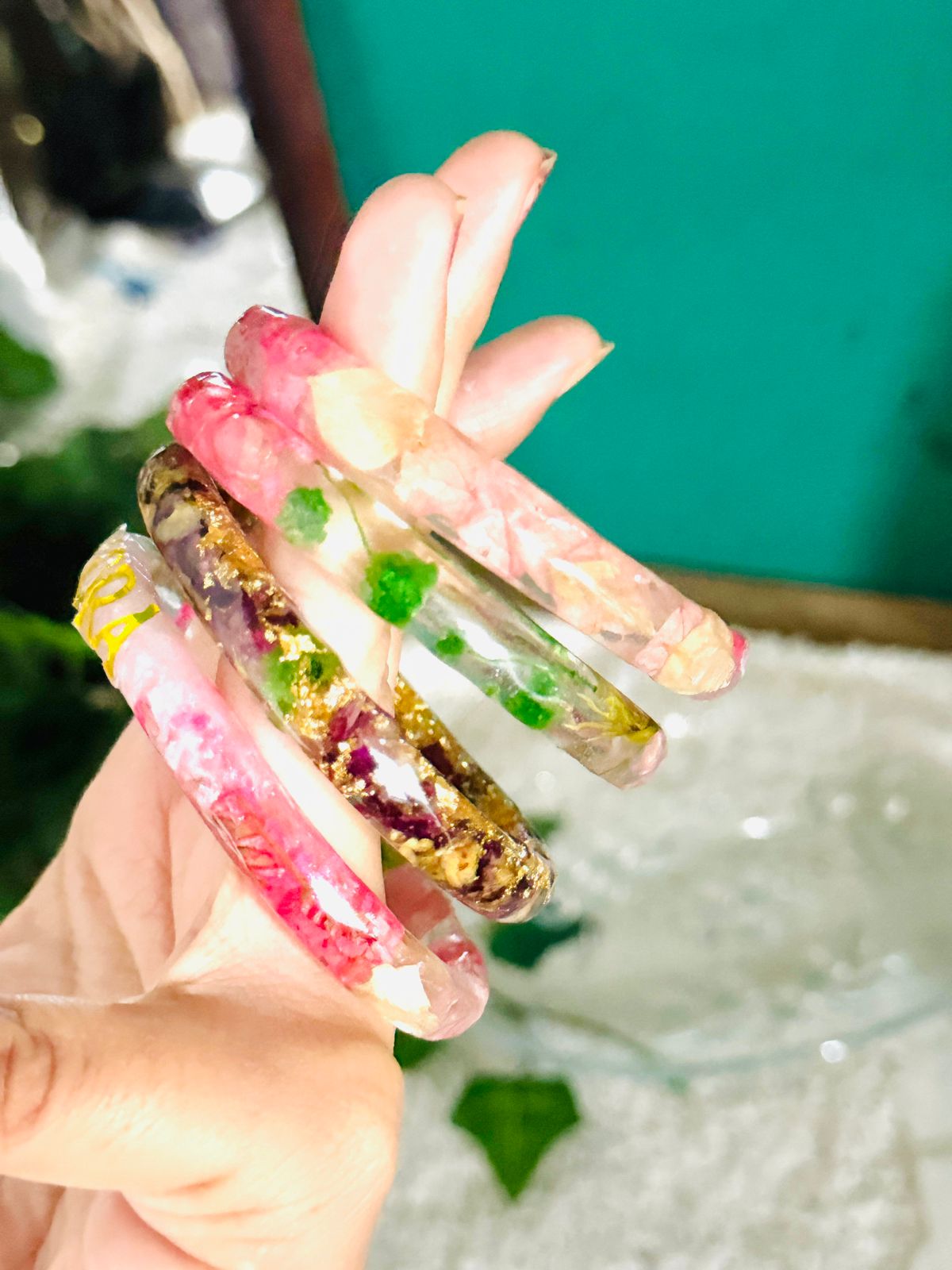 Resin bangles are stylish, lightweight accessories crafted from durable resin material. Known for their glossy finish and vibrant designs, these bangles often feature embedded elements such as glitter, dried flowers, beads, or colorful pigments, making each piece unique.